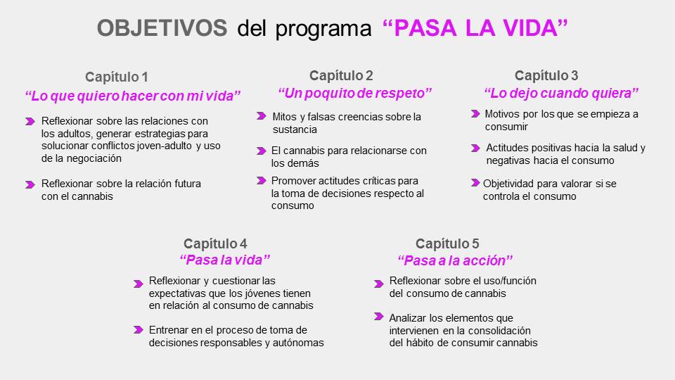 «PASA LA VIDA» es un programa de prevención selectiva de adicciones que consiste en un documento audiovisual con el que se pretende fomentar la reflexión y el debate en torno a imágenes, secuencias y diálogos que reflejan la percepción que los jóvenes tienen del consumo de drogas en general y de los supuestos efectos positivos de ese consumo en particular.