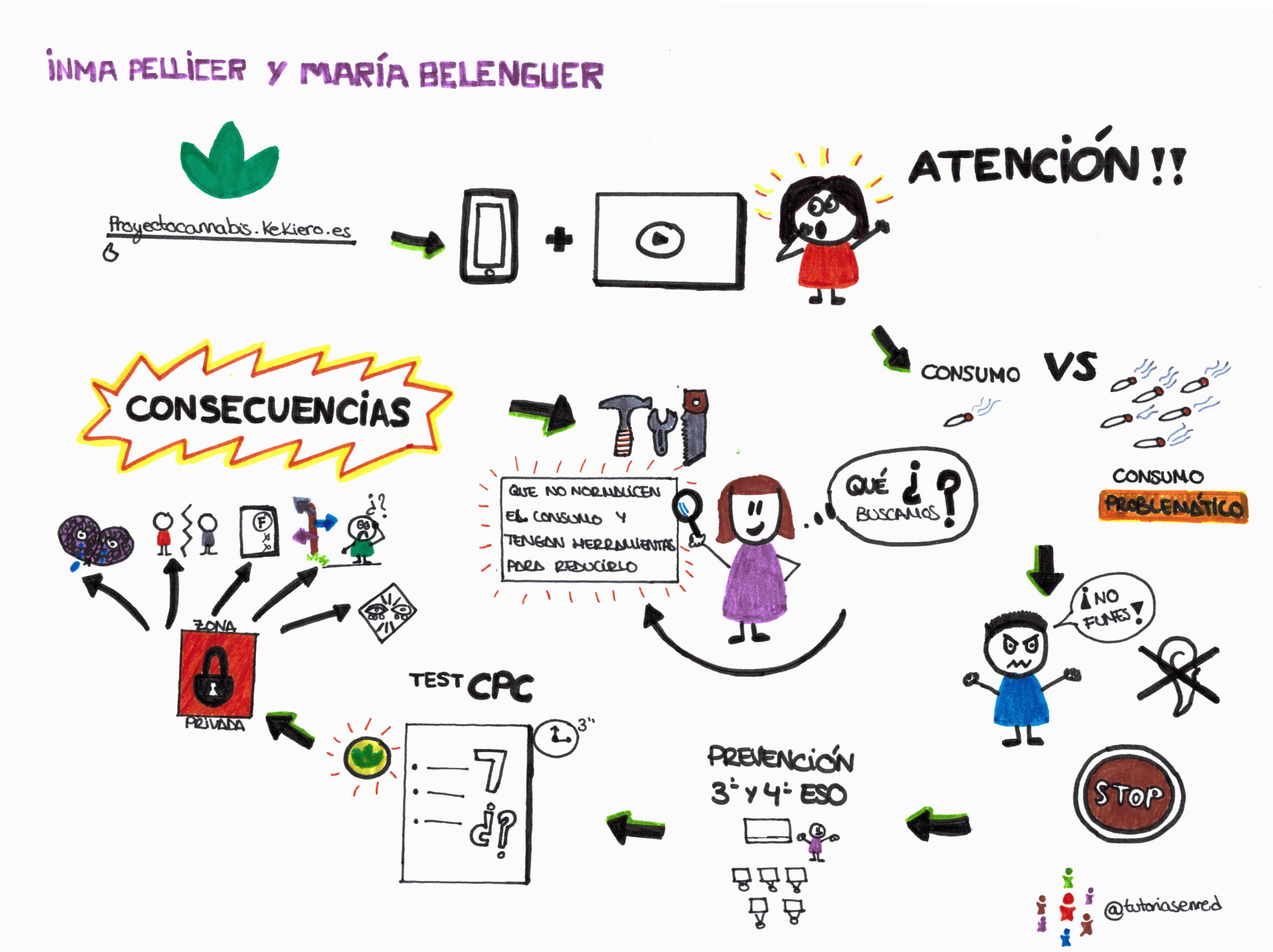 Después, tuvimos el placer de escuchar a Inma Pellicer, orientadora del IES Jordi de San Jordi y a María Belenguer, alumna de FP de Grado Superior en Integración Social. Nos hablaron de «Un proyecto de investigación y actuación en prevención del CONSUMO PROBLEMÁTICO DE CANNABIS desde la formación y el emprendimiento.»